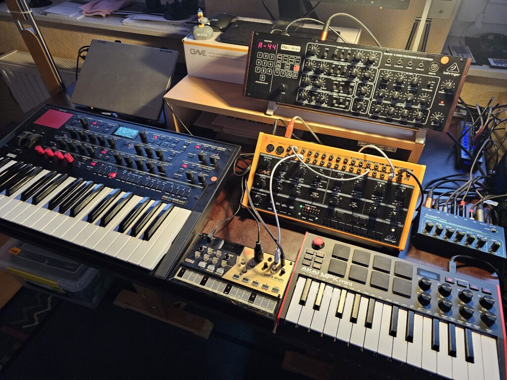 Begonnen habe ich eigentlich nur mit einer DAW, ohne externe Geräte, bis auf meinen ersten MIDI Controller, dem AKAI MPK mini. Ich verwende nach einen Beginn mit FL-Studio nun Studio One von Presonus. Mit FL Studio kam ich leider nicht zurecht, Studio One mit seinem linearen Workflow liegt mir besser (kann aber auch Pattern-basiert, wenn man will). Ableton war und ist mir als Hobbyist zu teuer. Aber wer weiß…