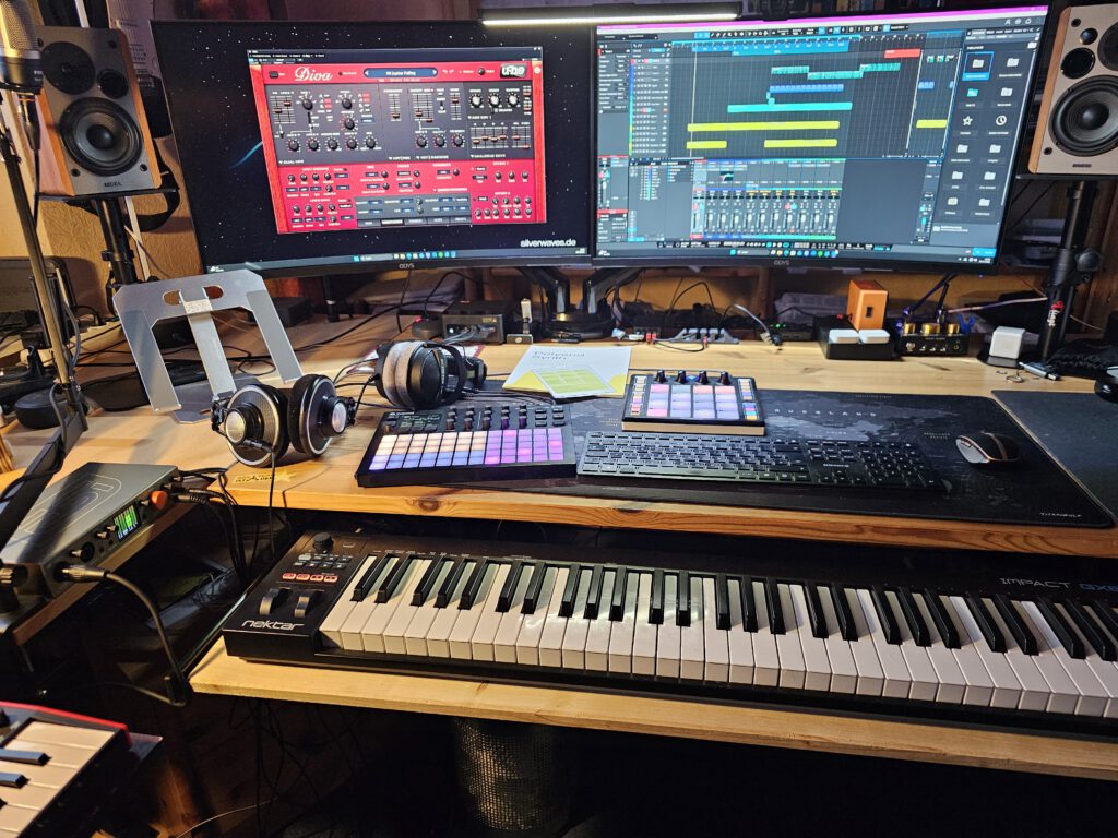 Das “Drumherum” besteht aus einem Nektar GX61 Keyboard, einem ESi Amber i4 Audio Interface und einem einfachen Mixer davor, der die externen Signale einsammelt. Gute Kopfhörer sind ein Muss, der Hausvorstand dankt es dir. Insbesondere, wenn er nunmal gar nichts mit der Art von Musik anfangen kann. Und jemand zuzuhören, der zum 100. mal dasselbe Pattern spielt, ist nachvollziehbar enervierend. Bei mir sind es einigermaßen günstige Kopfhörer: von Beyerdynamic der Klassiker DT 770 PRO (geschlossen) und ein AKG K702 (offen). Die Lautsprecher sind noch einfache Regallautsprecher von Edifier, die aber für ihren Preis exzellent sind und für mich erstmal ausreichen. Es sind halt keine dedizierten Nahfeldmonitore.